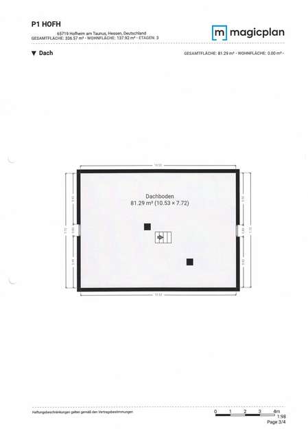 Das Dachgeschoss besitzt eine Firsthöhe von 2,40 m und die Dachdeckung besteht aus Betondachstein.